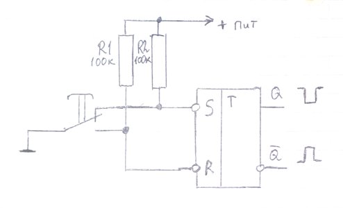 В обычном состоянии на S-вход поступает низкий уровень и триггер находится в состоянии 1. Но если нажать кнопку, низкий уровень попадёт на R-вход, и триггер переключится. Даже если в процессе контакт будет пропадать на мгновения, ничего страшного: это означает для триггера с инверсными входыми хранение предыдущего состояния. Обратный процесс происходит при отпускании кнопки. Таким образом, на выходах мы получаем хорошо сформированный импульс с чёткими фронтами, длительность которого равна длительности нажатия кнопки. Подтягивающие резисторы R1 и R2 обеспечивают высокий уровень сигнала на "не работающем" в данный момент входе, или даже на обоих входах если кнопка в процессе переключения.