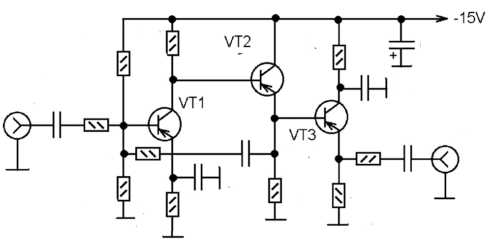 Один из простейших усилителей низкой частоты. Первый транзистор включен как ОЭ и усиливает мощность. Дальше идёт двухтактный каскад, оба транзистора в котором включены с общим коллектором - что позволяет без трансформатора согласовать выход с низкоомным громкоговорителем.