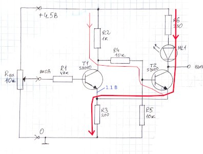 В исходном состоянии (на входе нет сигнала) транзистор Т1 закрыт. При этом на базе Т2 оказывается почти половина напряжения питания — через делитель R2-R4-R5. T2 открыт, светодиод горит, а на выходе низкий потенциал.